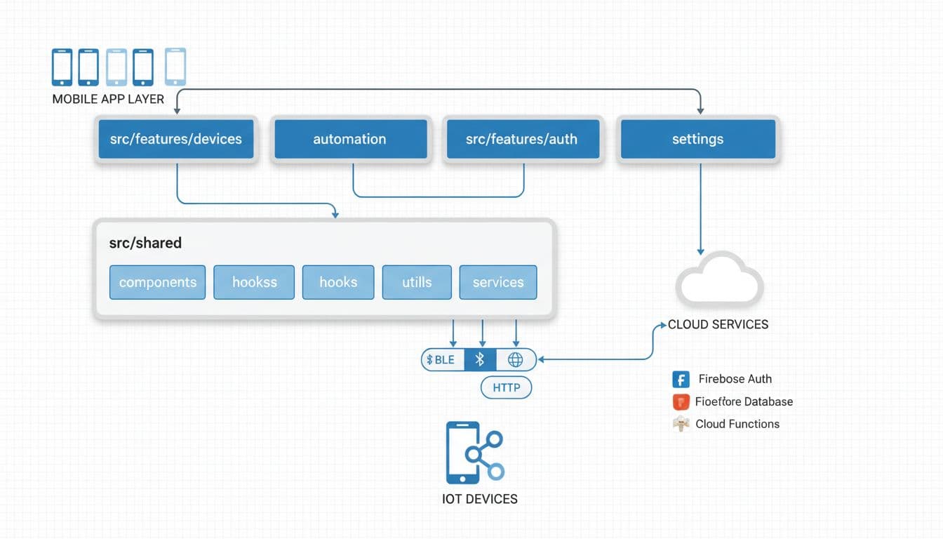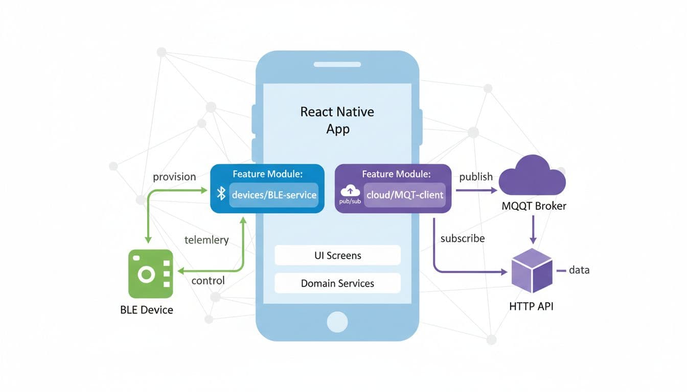 !Clean technical diagram of scalable React Native IoT app architecture with feature-first folder structure, showing mobile app layers, feature modules, data flows via BLE MQTT HTTP to IoT devices and Firebase cloud._High-level React Native IoT architecture with feature modules and device/cloud data flows. Image generated by AI._