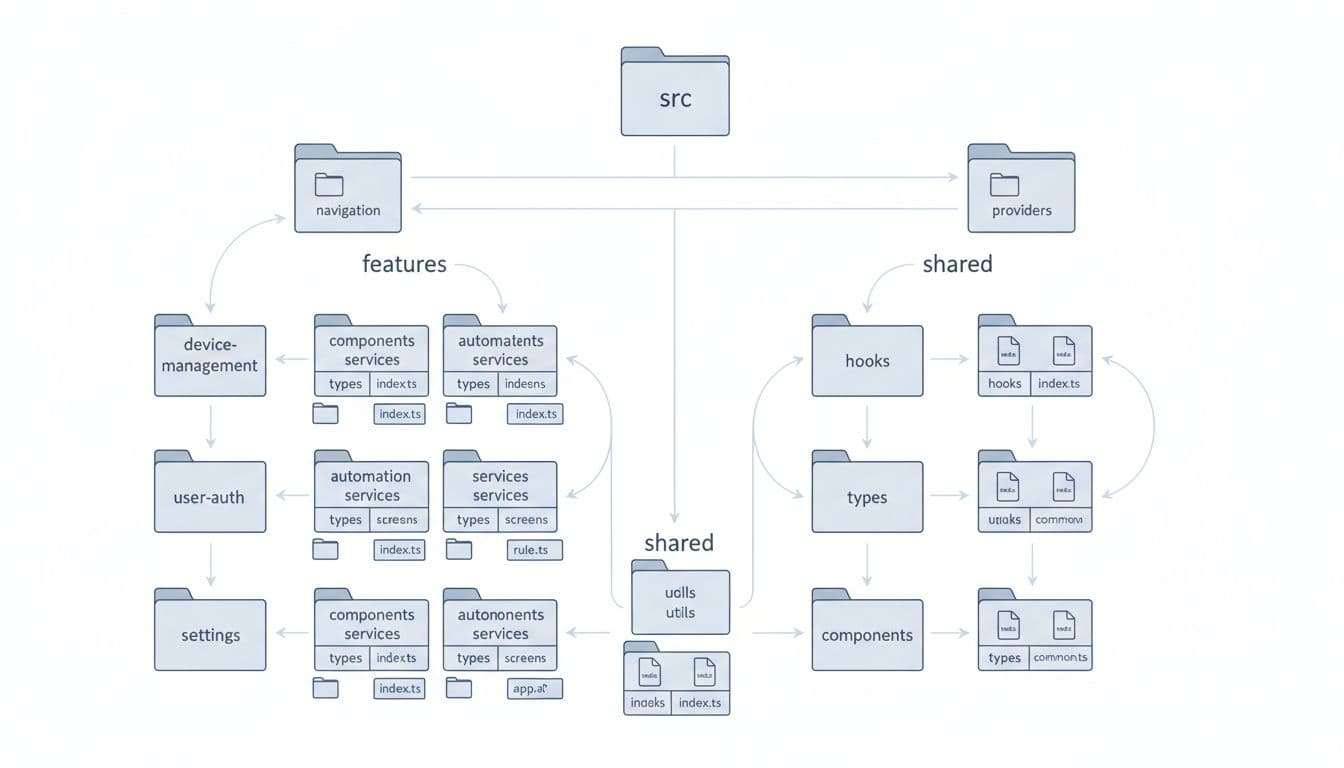 !Clean technical diagram of a feature-first folder structure tree for a React Native IoT application, featuring directories like device-management, automation-rules, user-auth, settings, shared utilities, and app navigation with folder icons and subtle import connections._Example of a feature-first folder tree for a React Native IoT app. Image created with AI._